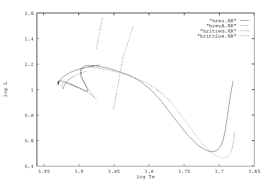 HR track for a star of 1.8MO (CESAM & HENYEY). Also is shown the instability strip red and blue borders. Reference: